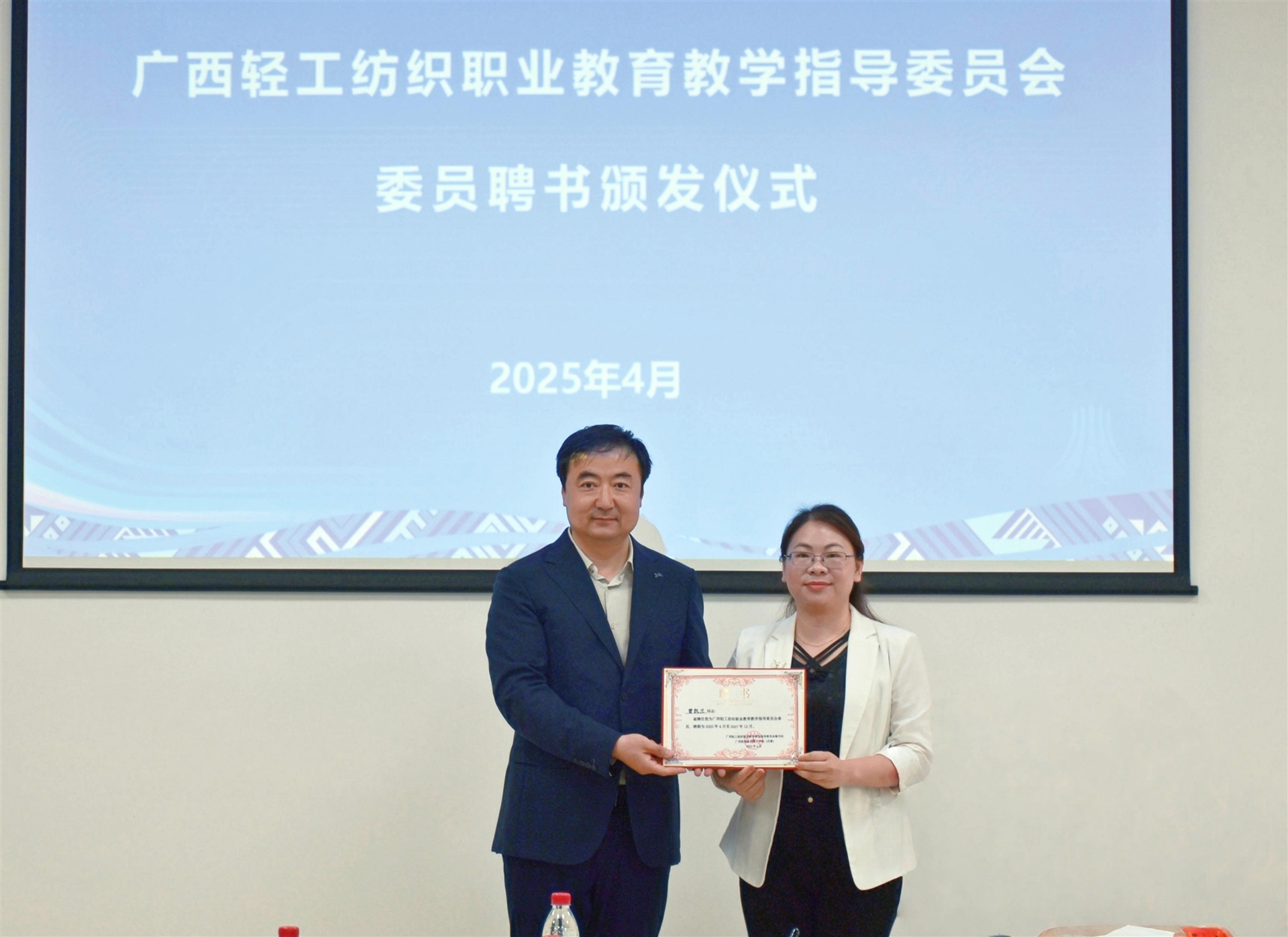隨后,中國(guó)紡織服裝教育學(xué)會(huì)會(huì)長(zhǎng)紀(jì)曉峰為百裕集團(tuán)等委員代表頒發(fā)了廣西輕工紡織職業(yè)教育教學(xué)指導(dǎo)委員會(huì)委員聘書。