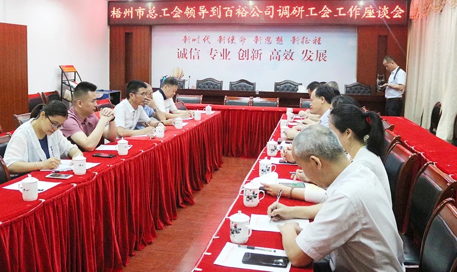 5月18日,梧州市總工會(huì)黨組書記、常務(wù)副主席謝善高、辦公室主任陳潔萍、勞經(jīng)部部長呂星等領(lǐng)導(dǎo)蒞臨百裕調(diào)研指導(dǎo),重點(diǎn)了解基層工會(huì)建設(shè)情況、運(yùn)轉(zhuǎn)情況以及勞模創(chuàng)新工作等方面的工作情況。岑溪市人大副主任、工會(huì)主席謝梅、百裕世紀(jì)工會(huì)主席曾晏來陪同調(diào)研。
