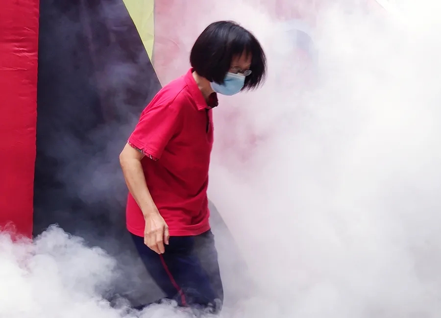 隨后,全體員工進行了濃煙體驗應急逃生和滅火的綜合演練。緊急逃生模擬封閉場館火災情景,全體員工在密閉的環(huán)境下演練正確逃生方法。濃煙體驗小黑屋被遮得嚴嚴實實,冒出陣陣濃煙,參與實訓的員工在徐教官的指導下,捂住口鼻,俯著身,沿著墻面,一一體驗了一把火場逃生的真實場景。