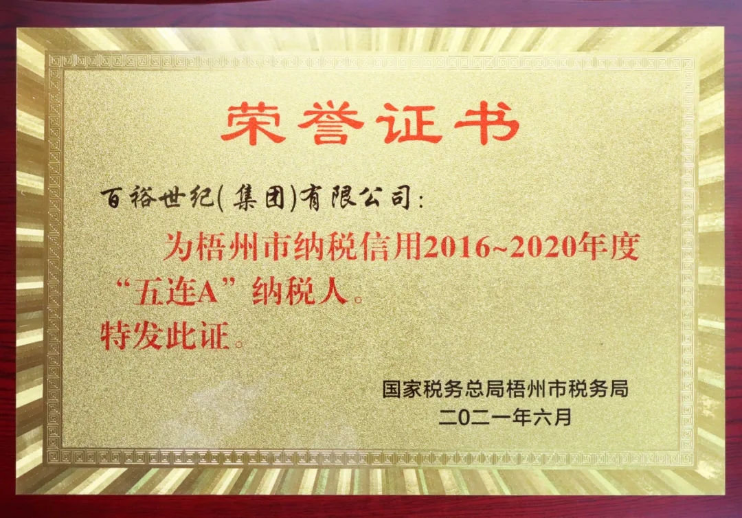 2021年6月,百裕世紀(jì)被國(guó)家稅務(wù)總局梧州市稅務(wù)局評(píng)定為梧州市納稅信用2016-2020年度“五連A”納稅人榮譽(yù)稱號(hào),并頒發(fā)證書(shū)。