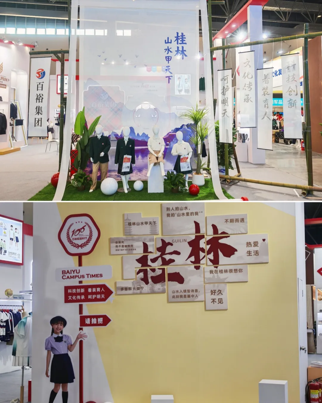 此次參展,百裕集團(tuán)巧妙融合桂林地域文化特色,將“水墨丹青”系列校服產(chǎn)品置于沉浸式的桂林山水場(chǎng)景之中:一幅徐徐展開的靈動(dòng)畫卷,將清新雅致的校服與詩(shī)意山水交相輝映,生動(dòng)詮釋了校園服飾美學(xué)與地域文化傳承的完美結(jié)合,彰顯了百裕在校服設(shè)計(jì)領(lǐng)域的深厚功底與美學(xué)追求,展位還精心設(shè)計(jì)打卡區(qū),吸引了眾多參觀者駐足欣賞、拍照留念。