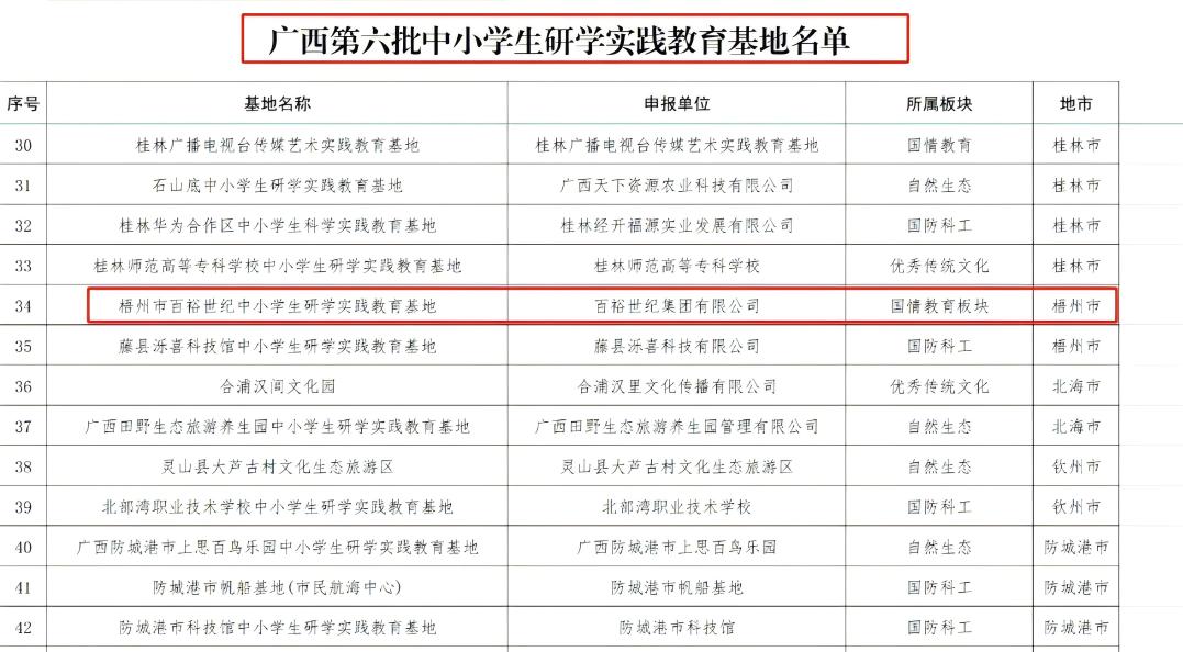 喜報丨百裕世紀(集團)入選廣西第六批中小學生研學實踐教育基地名單