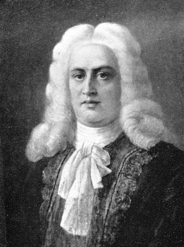 插畫,德國作曲家喬治·弗里德里希·亨德爾(1685-1759)。這個時期領帶的樣式在法朗士小說《領帶》中可見 :" 他的暗綠色上裝的領子豎得很高,他穿著一件南京紫花布背心,黑綢子寬領帶在他的頸子上繞了三圈。"