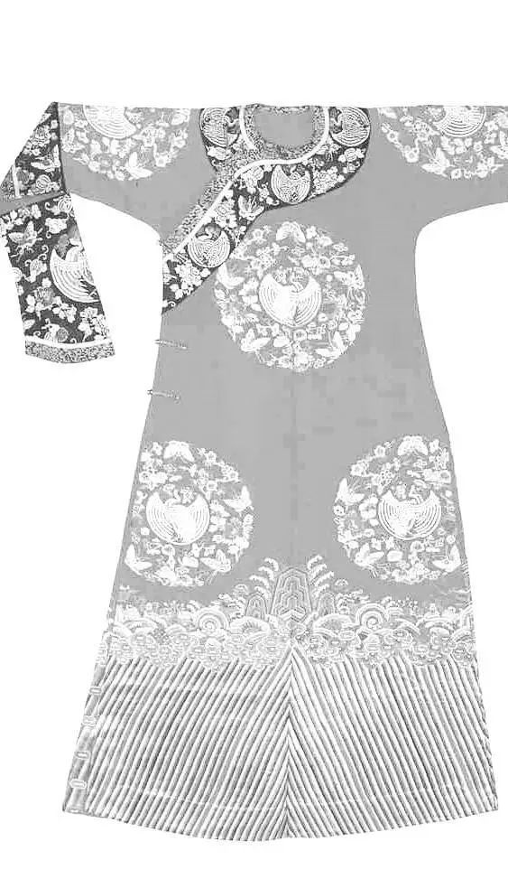 清朝后期,旗女(滿洲女子)所穿的長袍,衣身較為寬博,造型線條平直硬朗,衣長至腳踝?!霸獙氼I(lǐng)”用得十分普遍,領(lǐng)高蓋住腮碰到耳,袍身上多繡以各色花紋,領(lǐng)、袖、襟、裾都有多重寬闊的滾邊。同治年間,鑲、滾技藝達到高峰時期,有的甚至整件袍服全用刺繡、花邊鑲滾,幾乎難以辨認原本的衣料。旗女袍服的裝飾繁瑣至登峰造極的程度,從另一個方面也凸顯了強權(quán)霸主的欲望。