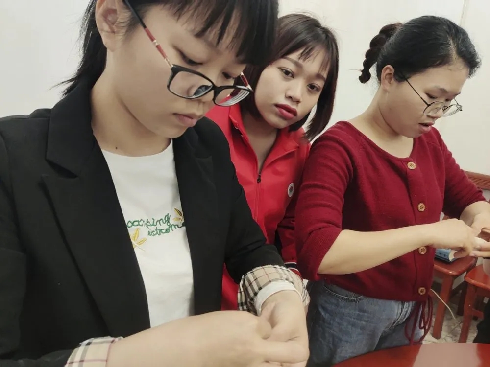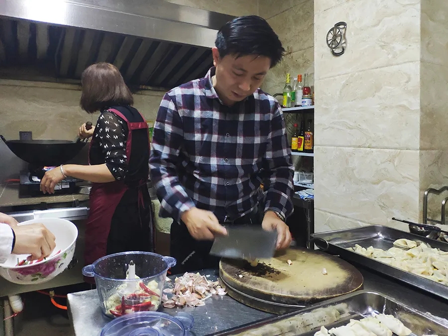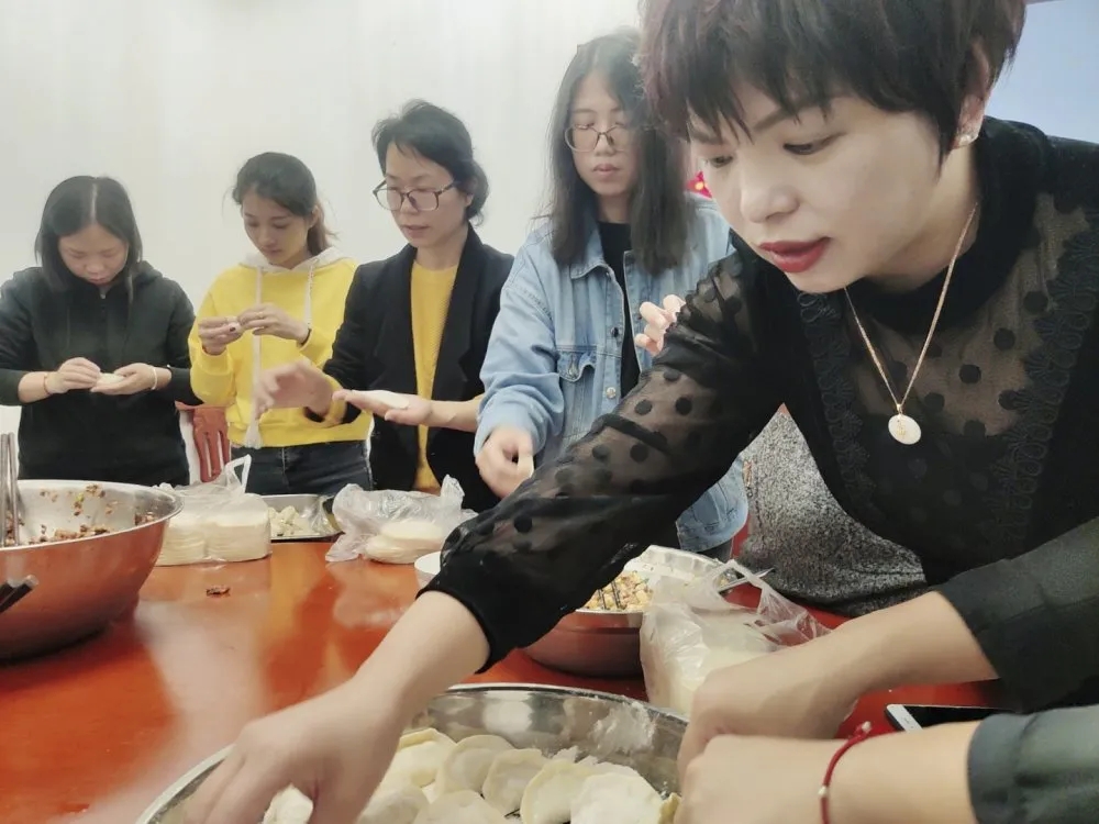 大家齊聚一堂相互交流經(jīng)驗(yàn)學(xué)習(xí),和面、搟皮、拌餡.....分工明細(xì),不一會(huì)兒,一盤盤整齊飽滿的餃子就出來了。