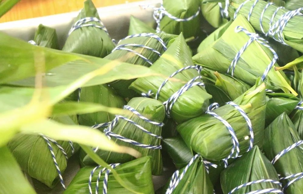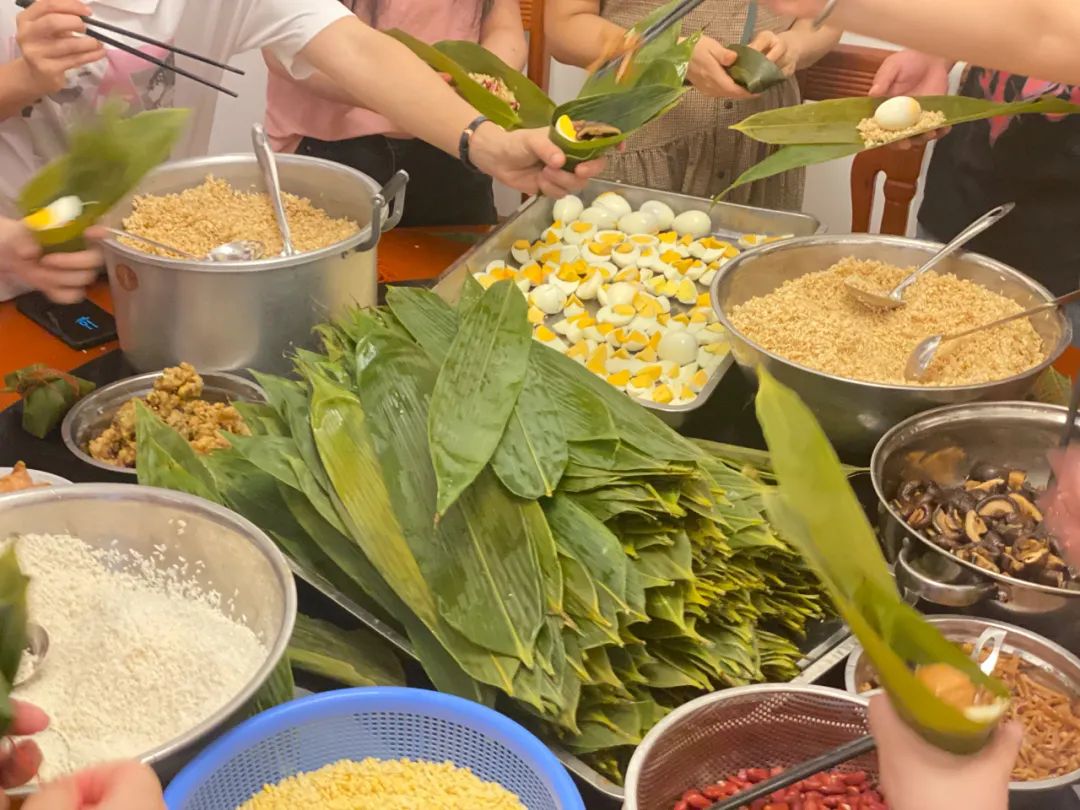 和心得,相互協(xié)作、其樂融融。填糯米、裹葉子、纏線,一雙雙巧手在歡聲笑語中舞動著,一串串精致的粽子就這樣在大家手中誕生了。